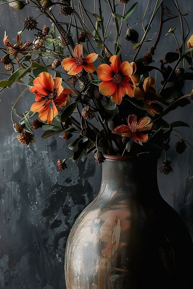 Ein Stillleben mit orangefarbenen Blumen in einer Vase vor einem schönen dunklen Hintergrund strahlt zeitlose Ruhe aus. Die zarten Blüten öffnen sich darin als Hommage an die Vergänglichkeit des Lebens.