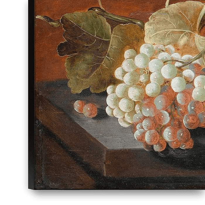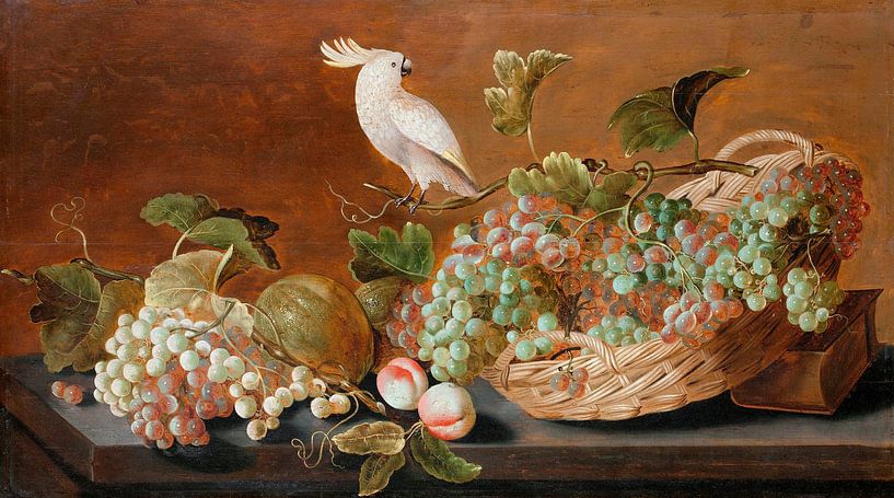 Rechts ein Korb mit verschiedenfarbigen Weintrauben und einem weißen Papagei, der auf ein Buch gelegt wird. Links auf dem Tisch liegen Trauben, zwei Melonen und zwei Pfirsiche.