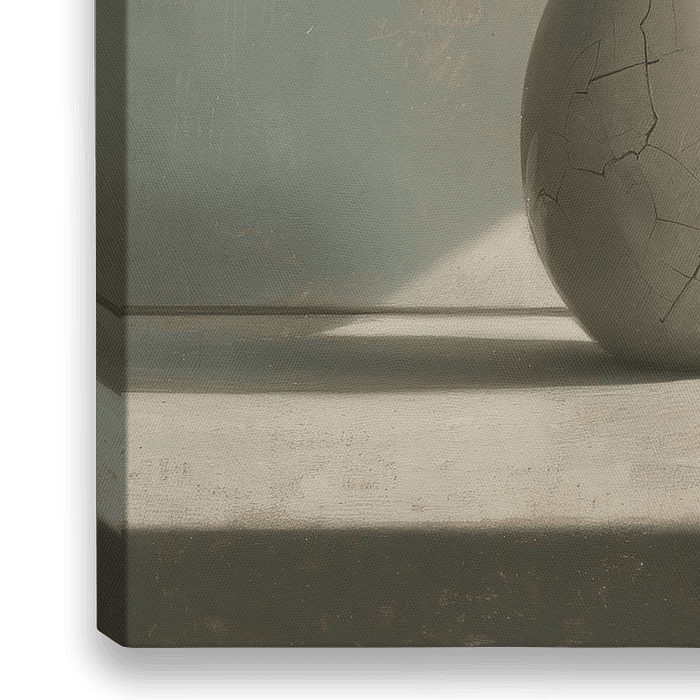 Stilleben - Dieses Stilleben zeigt eine zerbrochene Vase, eine Metallschüssel und eine Glasflasche, hervorgehoben durch ein diagonales Licht, das subtile Schatten auf einem fein strukturierten Hintergrund erzeugt.
