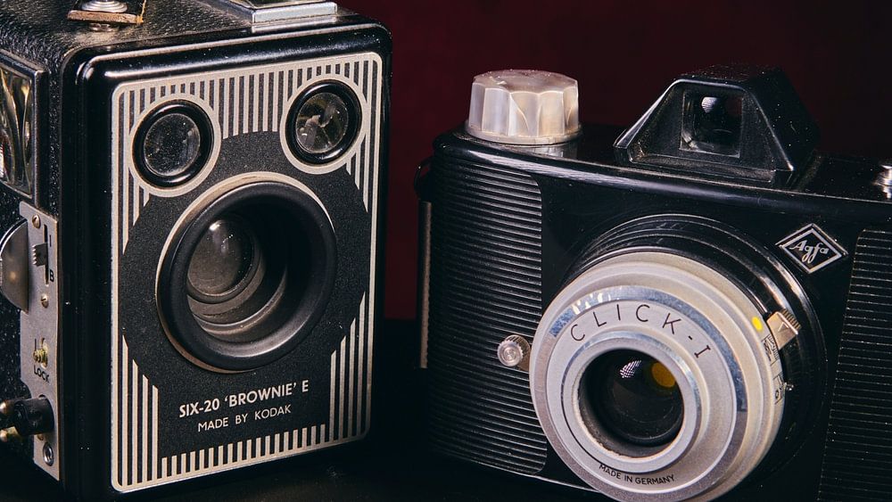 Zwei alte Fotokameras, fotografiert im Studio. Der Hintergrund wurde mit einer roten Lampe leicht angehoben, was eine schöne Tiefe und einen warmen Farbton ergibt. Die Kameras sind eine Kodak six 20 Brownie und eine Agfa Click-I