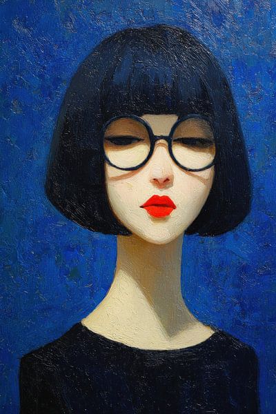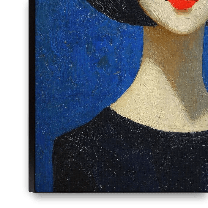 Ein stilles Porträt, in dem Form, Farbe und Emotion in einer fast zeitlosen Komposition verschmelzen. Die geschlossenen Augen verleihen dem Bild eine introvertierte Kraft, als würde die Welt für einen Moment ausgeschlossen. Das tiefe Blau wirkt wie ein stiller Raum um sie herum, während die roten Lippen einen subtilen, aber kraftvollen…