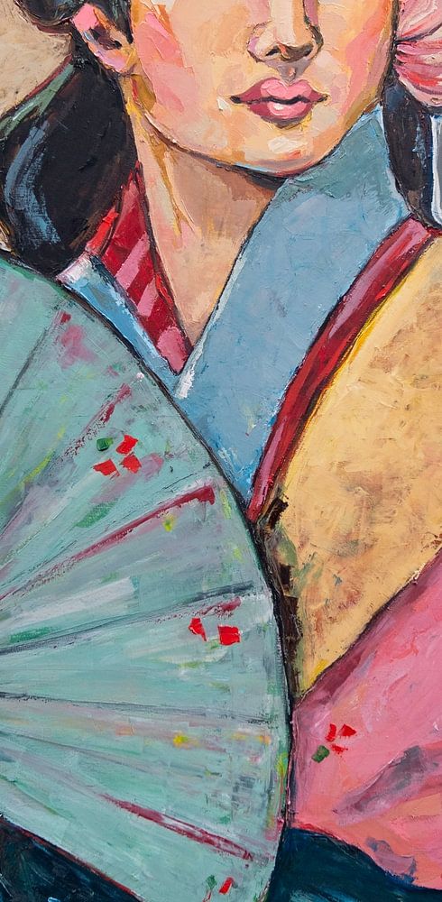 Fängt einen Moment gelassener Eleganz ein. Die Figur steht mit ruhiger Autorität und hält einen zarten Fächer in der Hand, der ihre Silhouette abmildert und der Komposition eine rhythmische Kurve verleiht. Ihr Blick schweift zur Seite, fokussiert auf etwas jenseits des Rahmens - einen Gedanken, eine Erinnerung oder vielleicht eine leise…