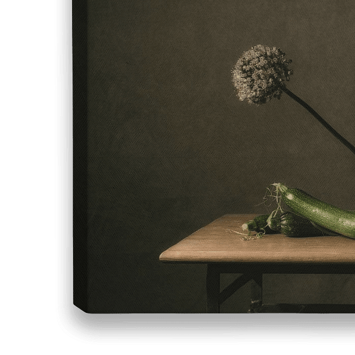 Das letzte vergessene Gemüse aus dem Garten, Lauch mit Blumen und eine einzelne Zucchini.