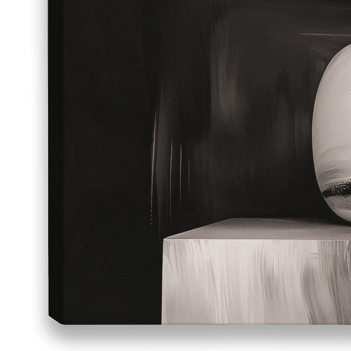 Abstraktes Stillleben im Japan-Stil mit Vasen und Marmorsteinen in einem dunklen Farbschema mit natürlichen Braun-, Schwarz-, Creme- und Grautönen.