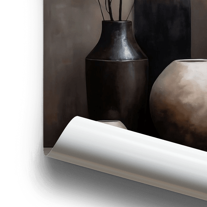 Abstraktes Stillleben im Japan-Stil mit Vasen in einer dunklen Farbgebung mit natürlichen Braun-, Taupe- und Kupfertönen.