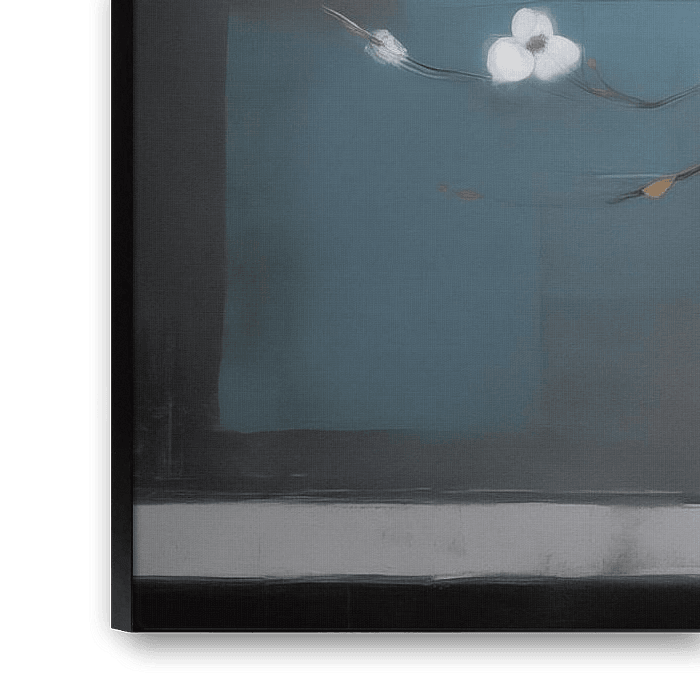 Stilleben im minimalistischen Japandi-Stil in grau-blauen Tönen mit einer Vase mit weißen Blumen und einer großen Schale in Silber- und Goldtönen.