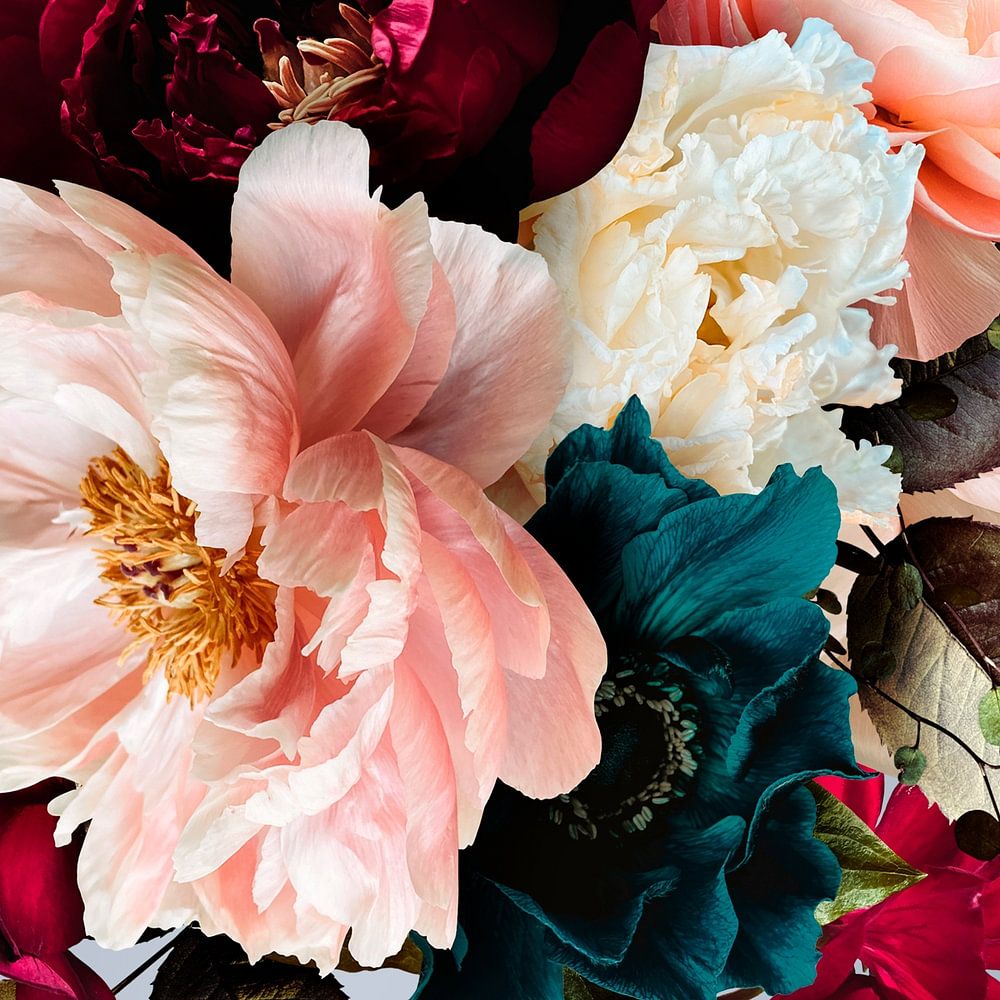 Stilleben mit Blumen: "Blumen sagen mehr als Worte". Sprechender Blumenstrauß in Rosa, Rot, Weiß und Blau vor einem graublauen Hintergrund.