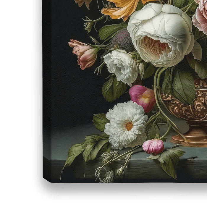 Bestelle dieses Blumen-Wandbild Stillleben mit Blumen im Stil alter Meister. von AVC Art Studio als Reproduktion auf Leinwand, Alu-Dibond, als Poster, Fototapete oder Acrylglasbild.