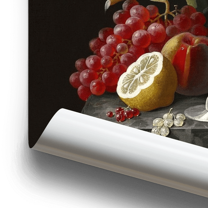Bestelle Stillleben mit Obst und Champagner, Severin Roesen als Reproduktion auf Leinwand, Alu-Dibond, als Poster, Fototapete oder Acrylglasbild.