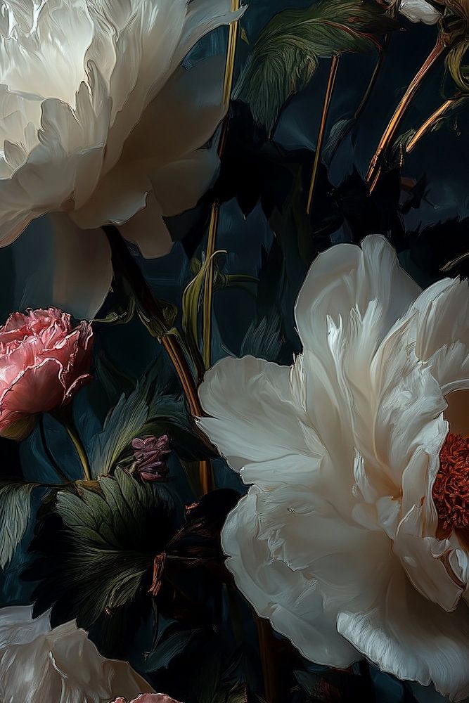 Ein dramatisches Stillleben aus üppigen weißen Pfingstrosen und zartrosa Rosen, die vor einem tiefdunklen Hintergrund schweben. Die Blüten sind wunderschön hervorgehoben und wirken fast barock, wobei die sanften Weiß- und Rosatöne einen Kontrast zum geheimnisvollen dunklen Dekor bilden. Ein dezenter blauer Nebel erzeugt eine verträumte, fast mystische Atmosphäre, die dem Ganzen eine zeitlose Eleganz verleiht.