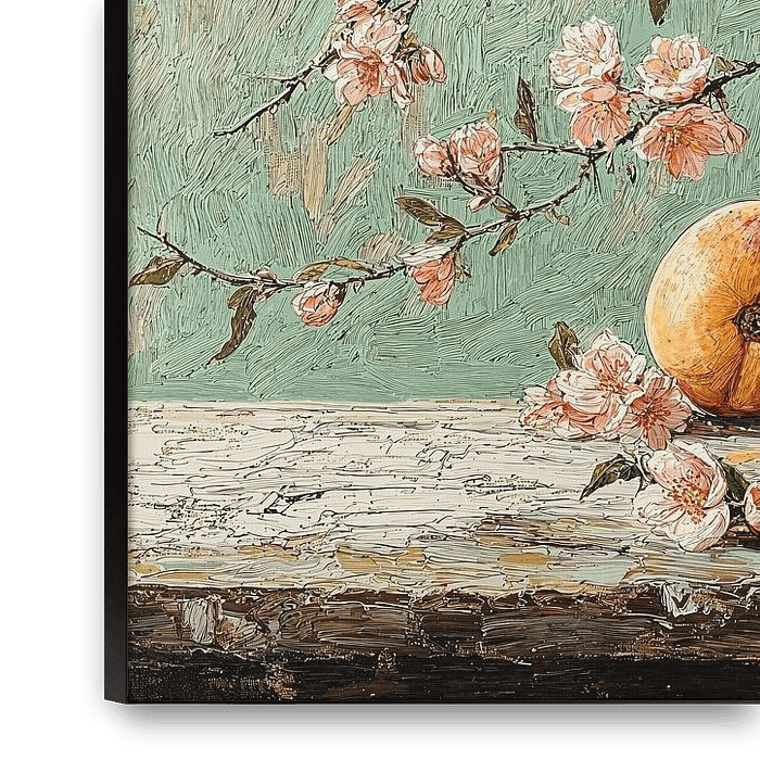 Ein Gemälde, das die Lebendigkeit und Fülle des Frühlings feiert. Die anmutig drapierten Pfirsichblütenzweige kontrastieren mit den kräftigen Früchten, umgeben von sanftem Licht vor einem gedämpften Hintergrund. Das Werk strahlt in seiner schlichten Gestaltung und den leuchtenden Farben eine heitere und besinnliche Stimmung aus.