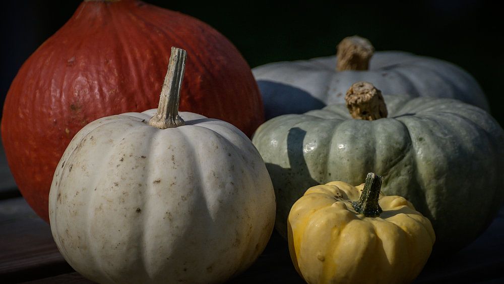 Stillleben von 6 Kürbissen in den weichen Farben, eine Herbstszene auf einem hölzernen Hintergrund mit einem dunklen vignettierten Hintergrund