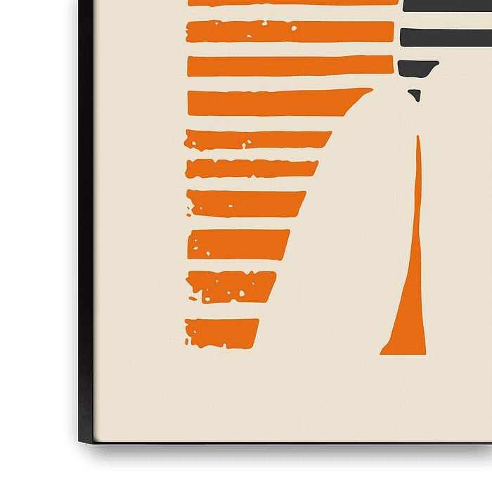 Dieses grafische Werk zeigt eine Frau in stilisierter Pose, die mit angezogenen Knien vor einem leuchtend orangefarbenen Hintergrund voller horizontaler Linien sitzt. Ihr kurzes Haar, die runde Sonnenbrille und das gestreifte Oberteil verleihen ihr eine ausgeprägte Retro-Ausstrahlung, während die Kombination aus Schwarz, Beige und Orange eine kräftige und harmonische Farbpalette bildet.