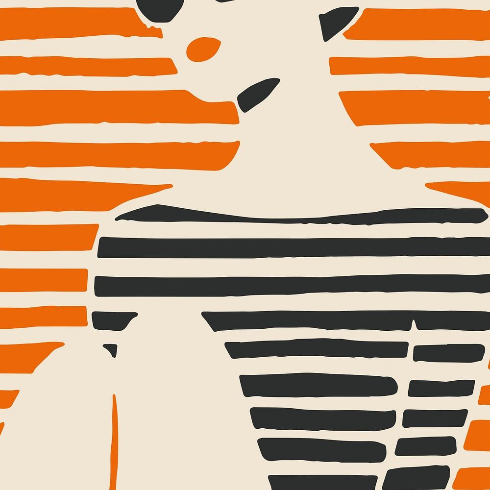 Die Linien ihrer Kleidung verschmelzen visuell mit dem orangefarbenen Hintergrund und lassen die Figur mit dem Muster verschmelzen, während sie sich von der Fläche löst. Das Zusammenspiel der Linien ist einfach und doch ausdrucksstark: Es evoziert sowohl Ruhe als auch Bewegung, als ob die Figur in einem stillen Moment an einem Sommertag gefangen wäre.