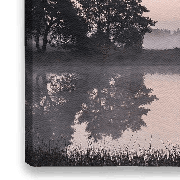 Auf diesem Foto stehen Sie morgens am Rande eines Moors und genießen den Morgentau, das Licht und die Spiegelung der Bäume im Wasser.