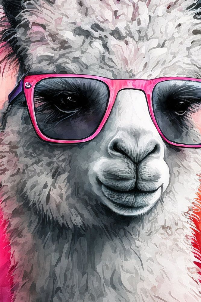 Ein elegantes Alpaka in schwarz-weißer Line Art trägt eine auffällige pinke Sonnenbrille und strahlt einen Hauch von Glamour aus. Das stilvolle Bild verbindet auf spielerische Weise Natur und Mode.
