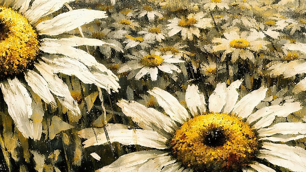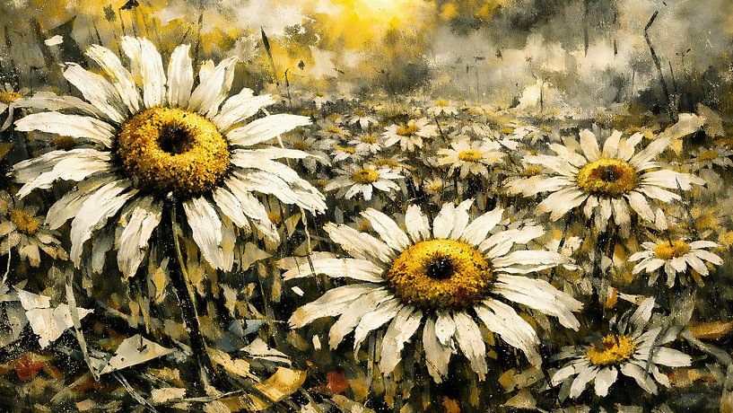 In diesem Kunstwerk, „Wervelwit“, trifft die Unschuld des Gänseblümchens auf die rohe Energie eines Sommergewitters. Die dicken, ausdrucksstarken Pinselstriche und der starke Kontrast zwischen dem tiefgrauen Himmel und den strahlend weißen Blütenblättern sorgen für eine Komposition, die niemals langweilig wird. Im Zentrum des Chaos…