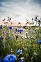 Stimmungsvolle Feldblumen am Ende des Frühlings an einem warmen Sommerabend. Die Sonne gibt einen schönen Lichtstrahl entlang der Kornblumen mit weißen und blauen Farben. Ein typisch idyllischer Blick durch die Ränder des holländischen Polders