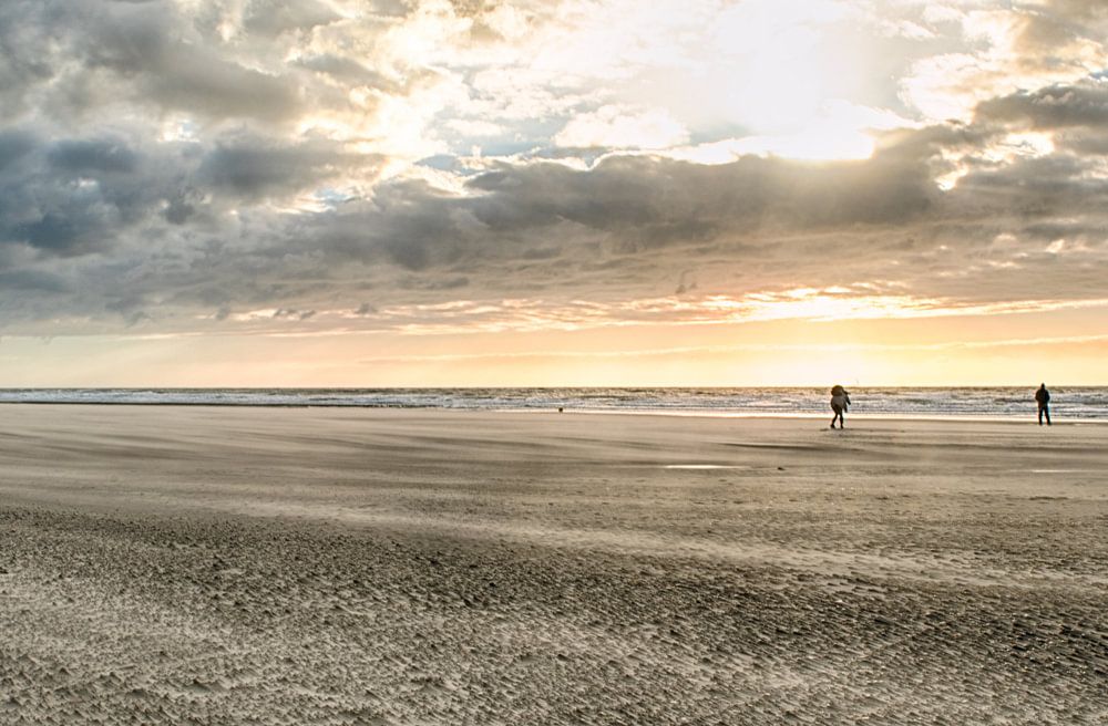 Twee personen die elkaar fotograferen in de zonsondergang op het strand van Bredene aan Zee.