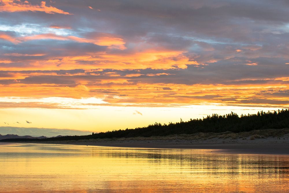Dieses Foto vom Waikuku-Strand bei Sonnenuntergang. Die schöne Reflexion der Sonne im Wasser macht dieses Foto einzigartig. Neuseeland Südinsel