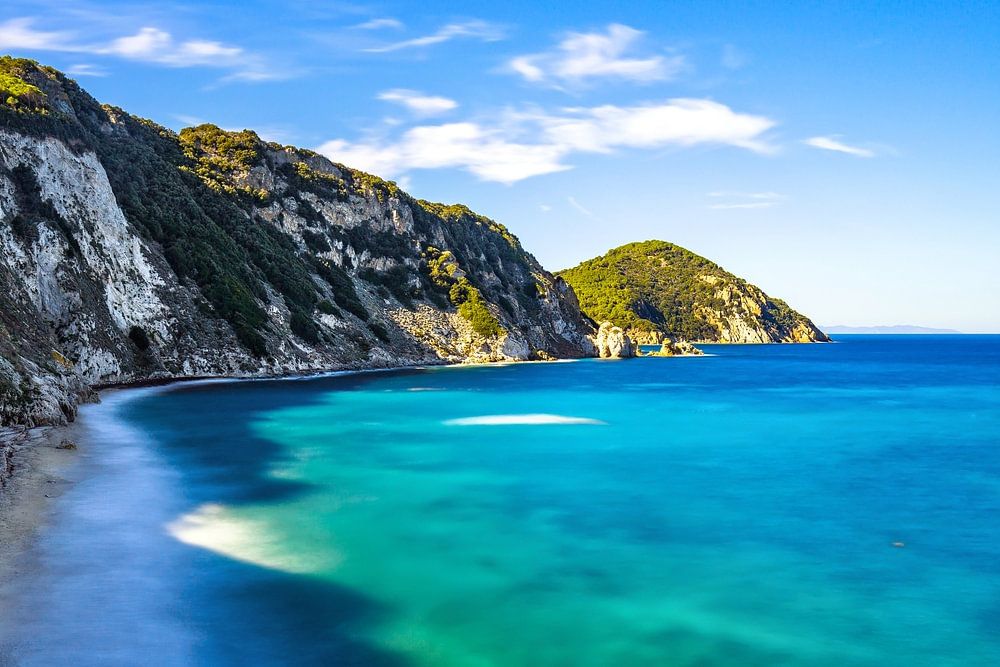 Türkisfarbenes Wasser trifft auf dramatische weiße Klippen am Strand von Sansone, einem der schönsten Küstenabschnitte der Insel Elba.