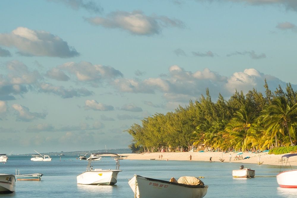 Boote im Wasser der Lagune bei Le Morne im Süden von Mauritius, Afrika.