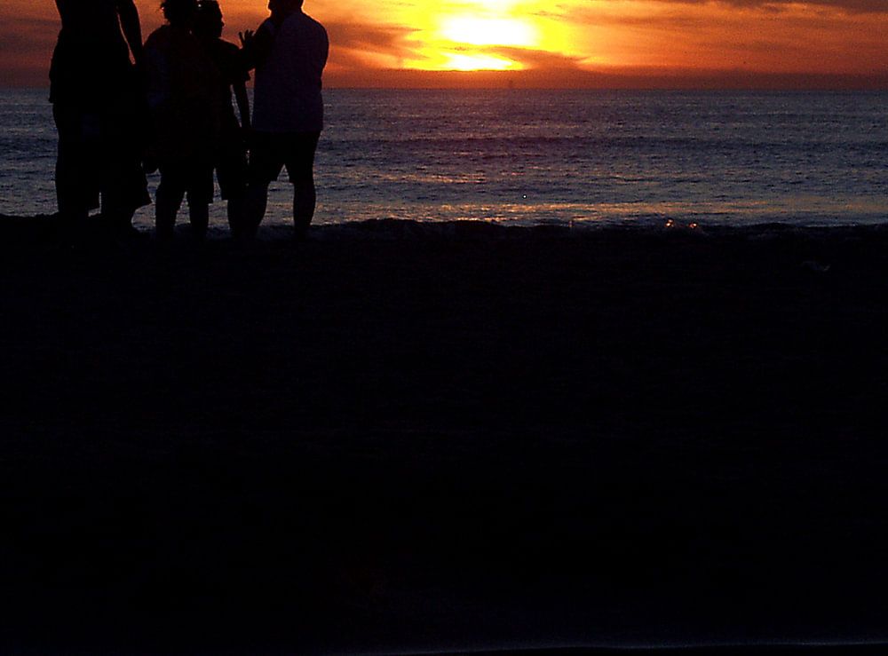 Groepje mensen die staan te genieten van de ondergaande zon aan het strand van Egmond aan zee.