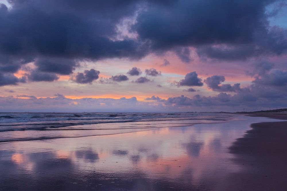 Ich kam kurz vor Sonnenuntergang an, so dass ich Zeit hatte, die Wolken und Dünen zu fotografieren. Gerade als ich dachte, das wäre erledigt, sah ich, dass das Meer von der untergehenden Sonne wunderschön rosa, lila und blau gefärbt war. Ich ging hinaus an den verlassenen Strand, um diese Bilder zu machen.