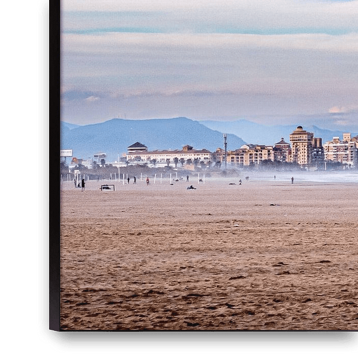 Bestelle dieses Landschafts-Wandbild Strand von Valencia mit Blick auf Port Saplaya von Dieter Walther als Reproduktion auf Leinwand, Alu-Dibond, als Poster, Fototapete oder Acrylglasbild.
