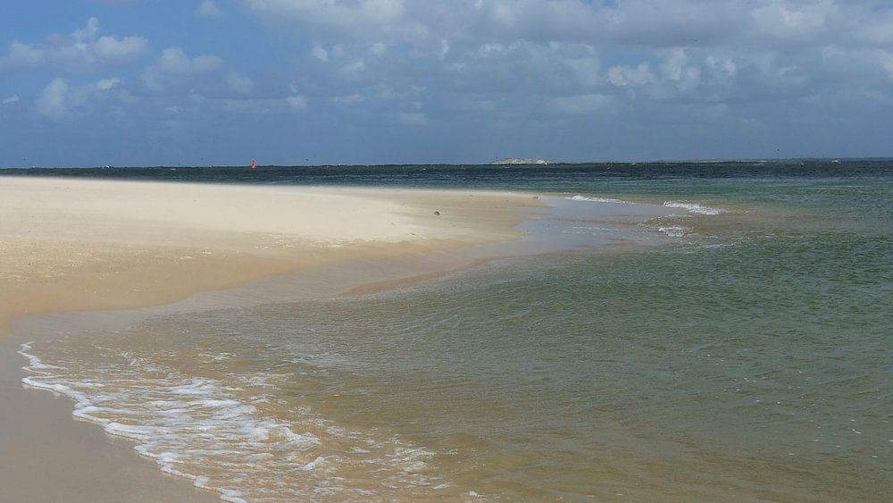 Sommertag am Strand von Vlieland. Ruhiges Meer, holländische Luft und weiße Sandstrände. Weite Aussicht über das Wattenmeer in Richtung Terschelling.