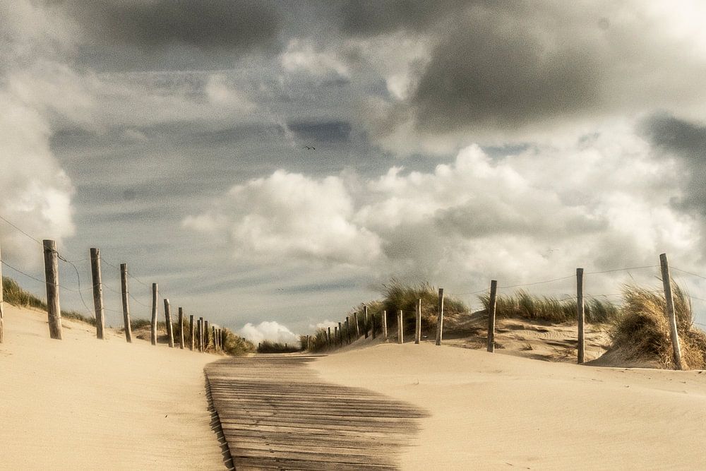 Die hölzerne Plattform halb unter dem Sand gibt diesem Foto etwas Besonderes. Dieses Foto wurde mit einem Polarisationsfilter aufgenommen, der den Himmel, das Licht und die Farben besser zur Geltung bringt.