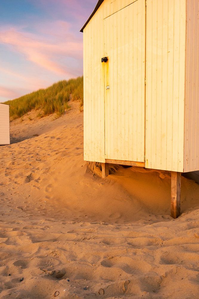 Strandkabinen in einer Reihe, am Strand von Domburg. Der Himmel färbt sich während des Sonnenuntergangs.