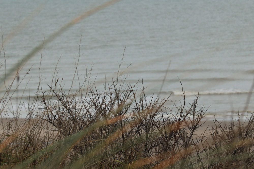 Durch das Gras kann man den Strand nicht sehen. Im Vordergrund sieht man verschwommene Grashalme, dahinter ein kleines Stück Strand mit dem weiten Meer.