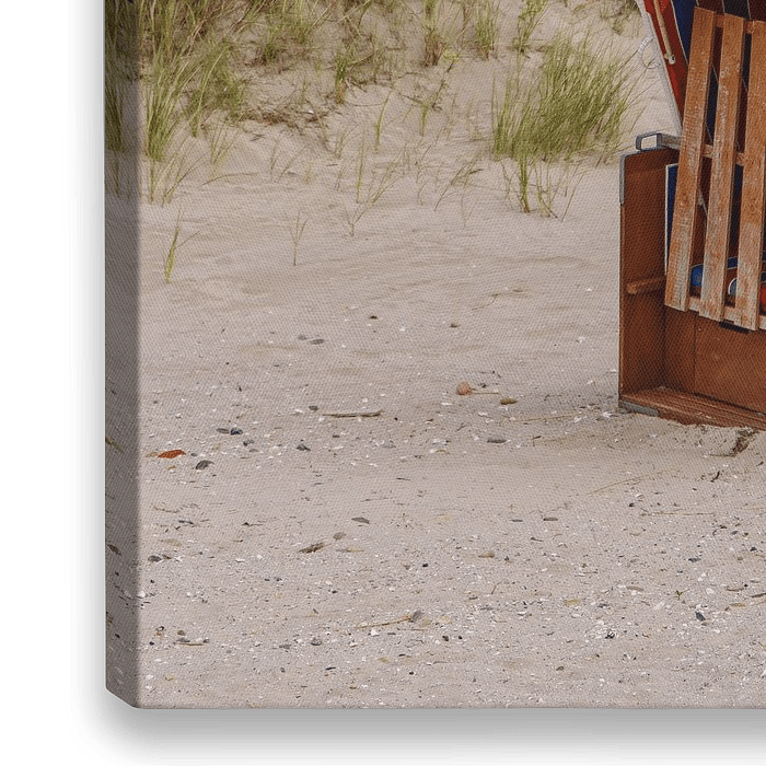 Strandkorb auf der Insel Föhr von dem ein Austernfischer gerade abfliegt.