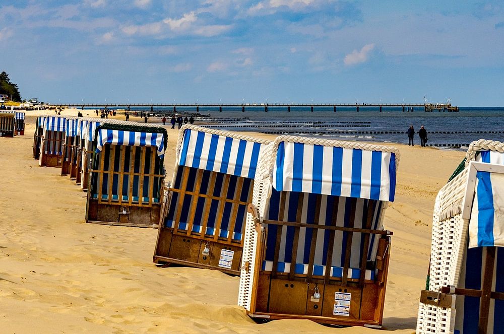 Strandkörbe im Kaiserbad Bansin. Diese sind wie Perlenschnüre aufgereiht und warten auf die warme Jahreszeit und sonnenhungrige Urlaubsgäste.