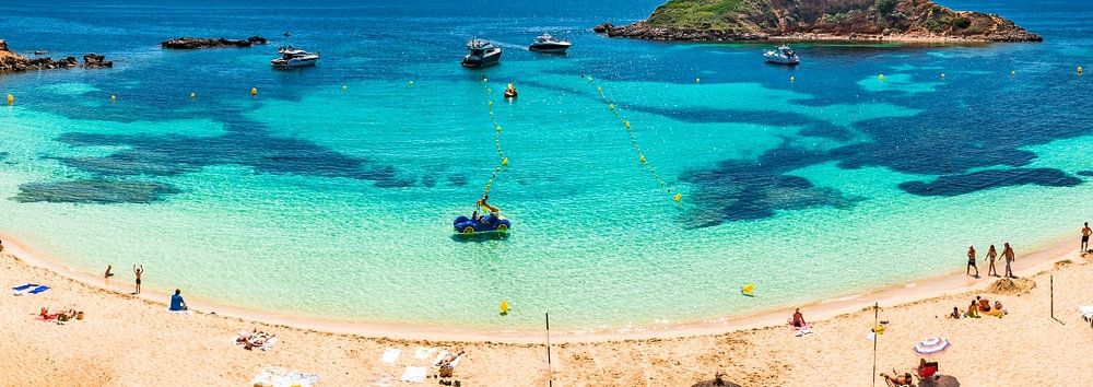 Strandpanorama von Platja de Portals Nous auf Mallorca, Spanien Balearen, Mallorca, Balearen, Balearisches Meer, Mittelmeer, Spanien