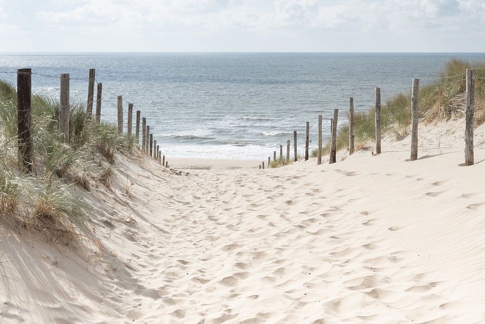 Foto von einem Strandeingang in der Nähe von Zandvoort. Es war ein schöner Aufstieg. Aber er war es wert. Ein schöner Anblick. Und ein echtes holländisches Bild, mit Dünen und Strandhafer. Pfähle mit Stacheldraht an der Seite. Und ein schöner bewölkter Himmel über der Nordsee. Das Foto wurde im April 2022 aufgenommen.