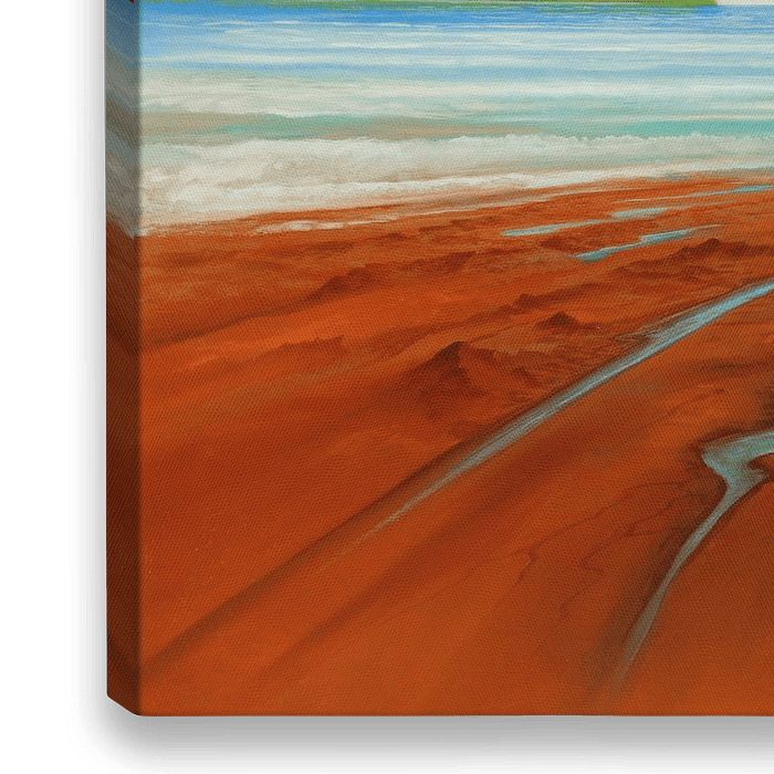 Am unteren Rand des Bildes erstreckt sich ein friedlicher und dynamisch gemalter Strand, dessen…