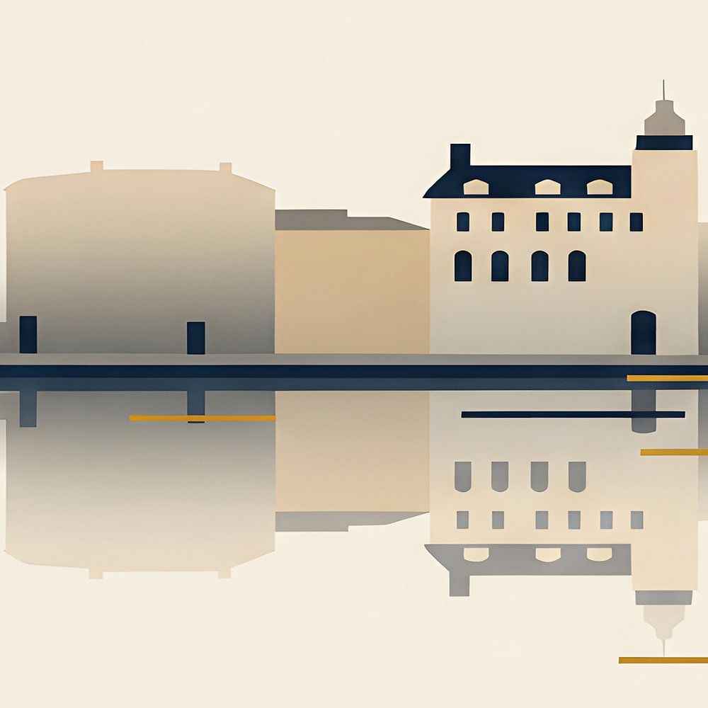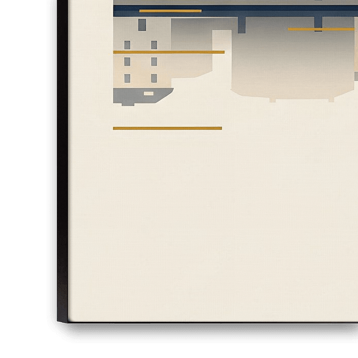 Eine raffinierte, abstrakte Interpretation des ikonischen Strandvägen in Stockholm. Dieses Werk verwendet klare geometrische Formen und eine subtile skandinavische Eleganz, um den historischen Boulevard darzustellen. Vereinfachte Silhouetten der großen Gebäude sitzen über einer perfekt ausbalancierten Reflexion, die das ruhige Wasser des Hafens andeutet.
