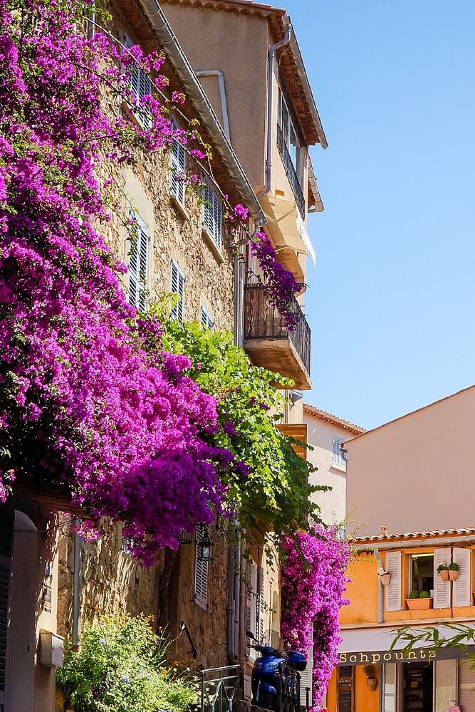 Bunte Straße im französischen Badeort Saint Tropez. Lila Blumen und bunte Fensterläden schmücken diese hübsche kleine Straße in Saint Tropez, der berühmtesten Stadt an der Côte d'azur in Frankreich.