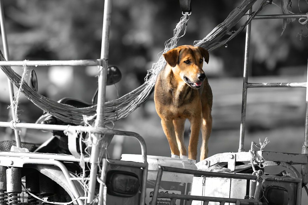 Eine faszinierende Fotografie, in deren Mittelpunkt ein brauner Hund steht, der stolz in der Ladefläche eines verwitterten Verkaufswagens steht. Der Hund ist die einzige Farbe in einem ansonsten schwarz-weißen Bild, was seine Präsenz noch unterstreicht.