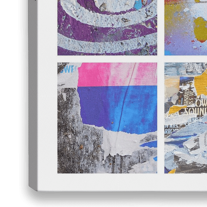 Bunte Collage aus Street Art und moderner Kunst. Eine Zusammenstellung des Straßenlebens: die Farben, denen man begegnet, die Graffiti, die Poster. Jede Stadt hat ihre eigene urbane Atmosphäre. Diese Collage ist ein lebendiger Ausdruck einer modernen Stadt. Denken Sie an Berlin, Lissabon, New York, Valencia...