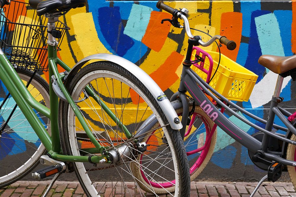 Zwei farbenfrohe Fahrräder in einem ebenso farbenfrohen Straßenbild, entdeckt im Stadtzentrum von Breda (NL).