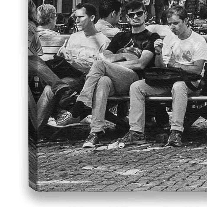 Thema Straßenfotografie in Schwarz-Weiß. Panoramafoto von zufällig auf einer Bank sitzenden Menschen, die ihren alltäglichen Dingen in Amsterdam nachgehen. Geeignet für große(re) Flächen oder als Hintergrund.
