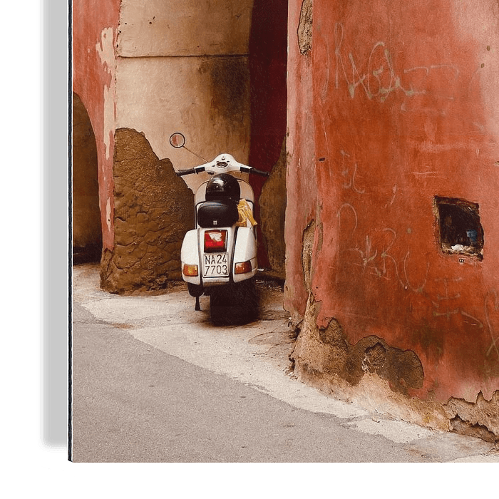 Bestelle das Foto Straßenszene mit Motorroller in Italien von Judith van Wijk als Reproduktion auf Leinwand, Alu-Dibond, als Poster, Fototapete oder Acrylglasbild.