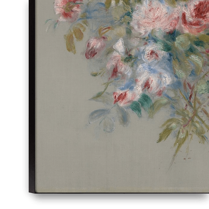 „Rosenbouquet“, Pierre-Auguste Renoir Im Sommer 1879 lud der Bankier und Diplomat Paul Berard Renoir in sein Landhaus in der Normandie ein. Während seines Aufenthalts malte der Künstler Porträts von Berards Kindern und schuf mehrere Wanddekorationen, darunter diese für eine Tür in der Bibliothek. Während die geordnete Anordnung des Straußes traditionell ist, spiegeln die dicken Pinselstriche und lebhaften Farben Renoirs impressionistische Technik wider.