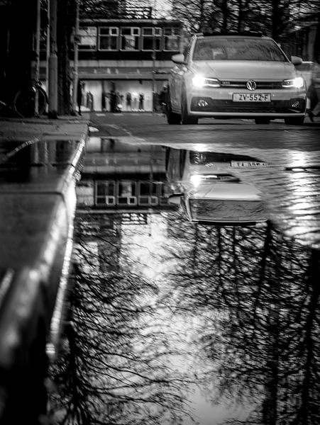 An einem regnerischen Tag konnte ich dieses Foto mit einem Auto machen, das sich in einer Wasserpfütze spiegelt. Das Foto wurde in Rotterdam aufgenommen.
