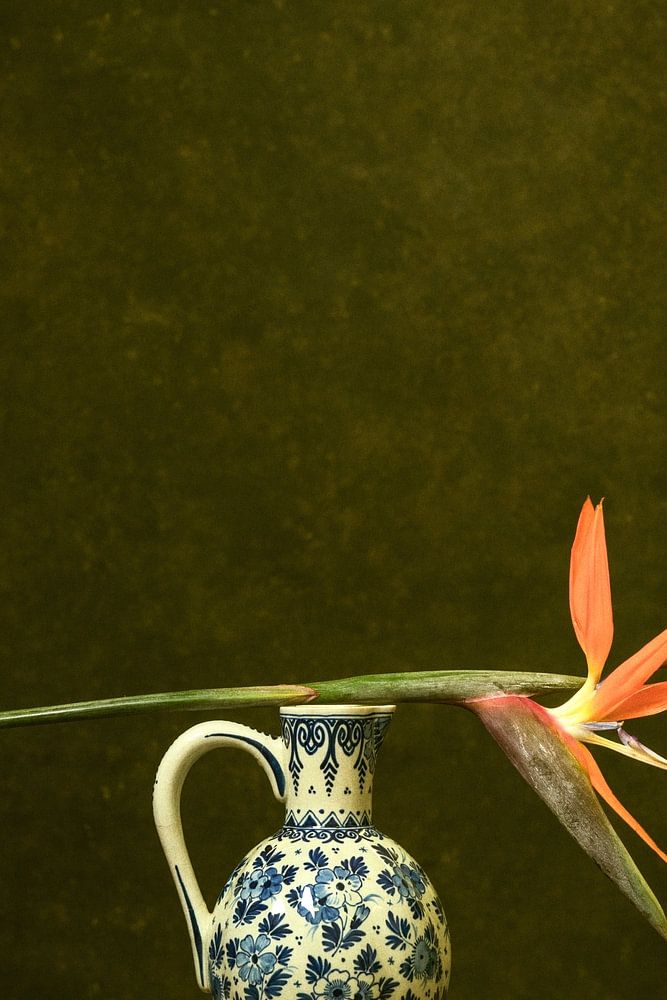 Stilleben mit Blumen: Strelitzia auf einem Milchkännchen