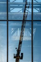 Fensterfassade mit Blick auf die Decke und Spiegelung eines Krans. 5-lagiges Foto!