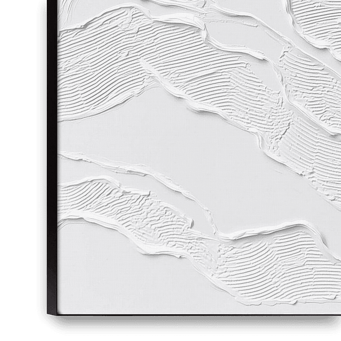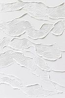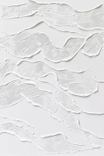 Ein rhythmisches Spiel aus wellenförmigen, organischen Formen, die sich wie sanfte Strömungen über die Oberfläche bewegen. In einer rein weißen Farbpalette entfalten sich erhabene Strukturbahnen, in denen feine, parallele Linien sichtbar sind – als wäre die Farbe mit einem Kamm oder einem Werkzeug sorgfältig bearbeitet worden. Diese…